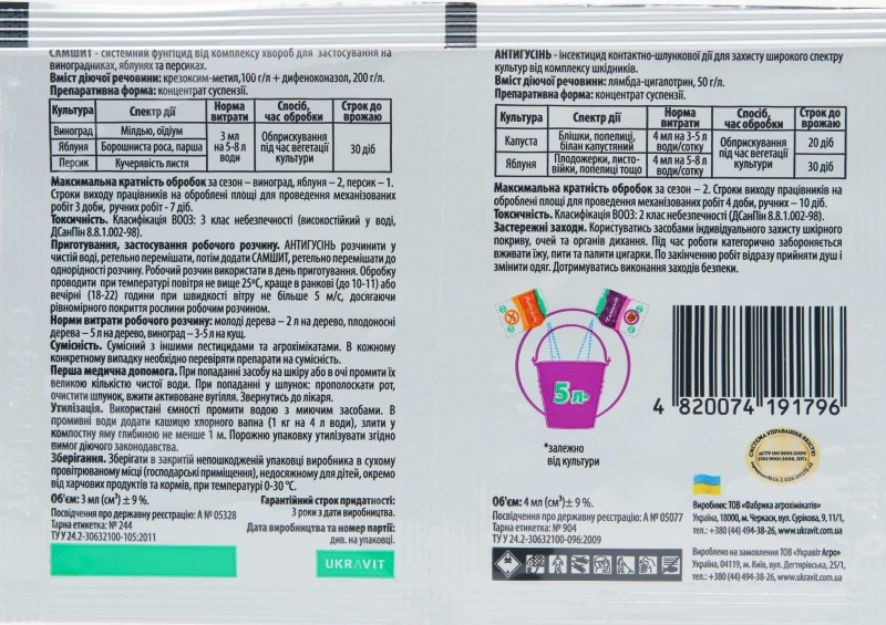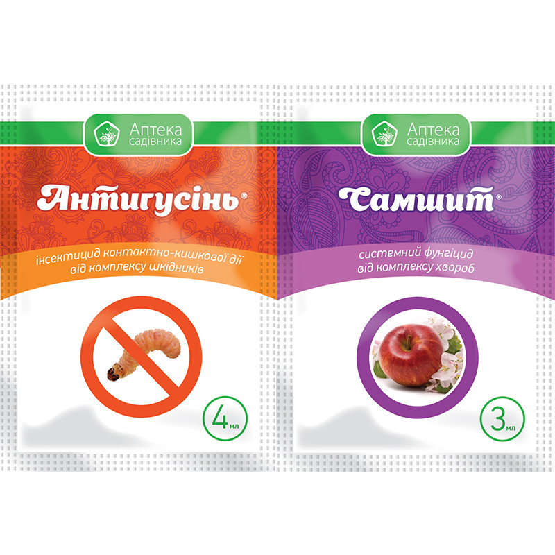 Антигусінь+Самшит – бінарний комплект інсекто-фунгіцидної дії для одночасного контролю шкідників та хвороб у насадженнях плодово-ягідних культур.