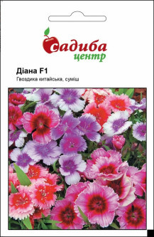 Гвоздика китайська Діана F1 – унікальна рослина з раннім періодом цвітіння, компактним габітусом і гігантськими квітами. Висота: в горщику 15-20 см, в саду: 20-25 см, ширина – 15-20 см. Широкий спектр кольорів: яскравих однотонних і незвичайних двоколірних. Цвітіння рясне і тривале з початку літа до заморозків. Рослина невибаглива, не боїться заморозків, добре розвивається на відкритих сонячних місцях і в легкій півтіні. Використовується для оформлення клумб, бордюрів. Чудово виглядає в горщиках і контейнерах (10 см). Термін вирощування від посіву насіння 15-18 тижнів.