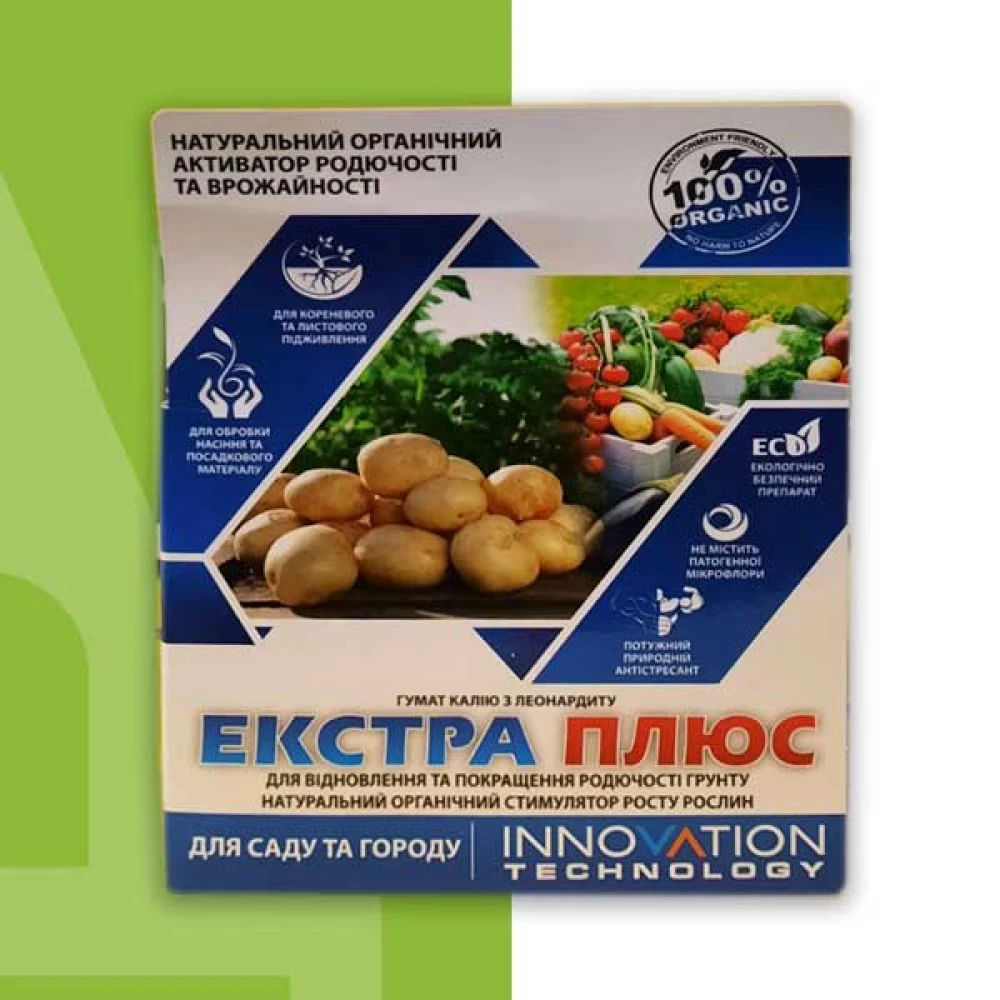 Екстра Плюс – натуральний органічний активатор родючості та росту рослин. Виготовляється із екологічно чистого екстракту бурого вугілля найвищої якості – леонардиту, із застосуванням сучасних іноваційних технологій без використання синтетичних та штучних компонентів. Не містить в собі патогенних мікроорганізмів, вірусів, яєць паразитів та шкідників.