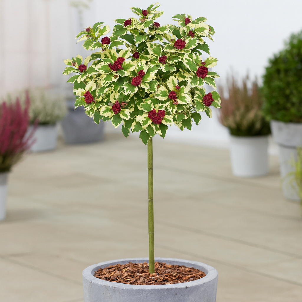 • Особливості: Один із найефектніших варієгатних сортів. Поєднує декоративне листя з гарним махровим цвітінням. Штамбова форма виглядає особливо елегантно у поодиноких посадках, на газонах чи біля входу до будинку. Добре переносить стрижку і формування крони.
