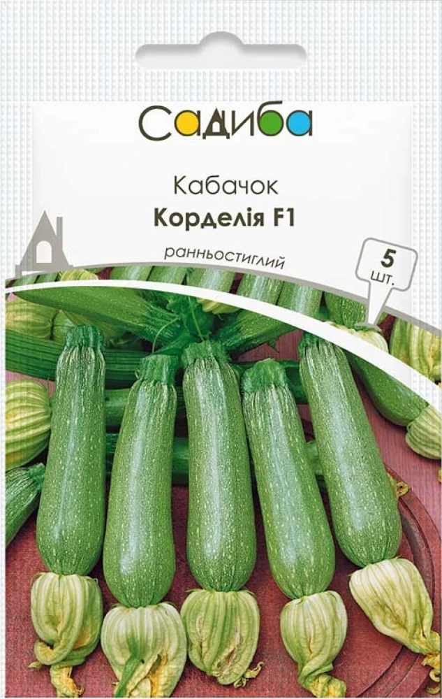 Кабачок Корделія F1 – ранньостиглий (40-42 дні) гібрид кущового кабачка для вирощування навесні під укриттям і для посадок в кінці літа або на початку осені. Рівненькі циліндричні плоди насиченого світло-зеленого кольору, вагою 200-500 г, з щільним м’якушем.