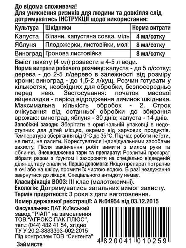 Пакет 4 мл розвести в 5 л води для обприскування 1 сотки овочів. Для обприскування яблуні й винограду треба 2 пакети по 4 мл кожен розвести в 10 л води ( на 1 сотку саду чи винограду).