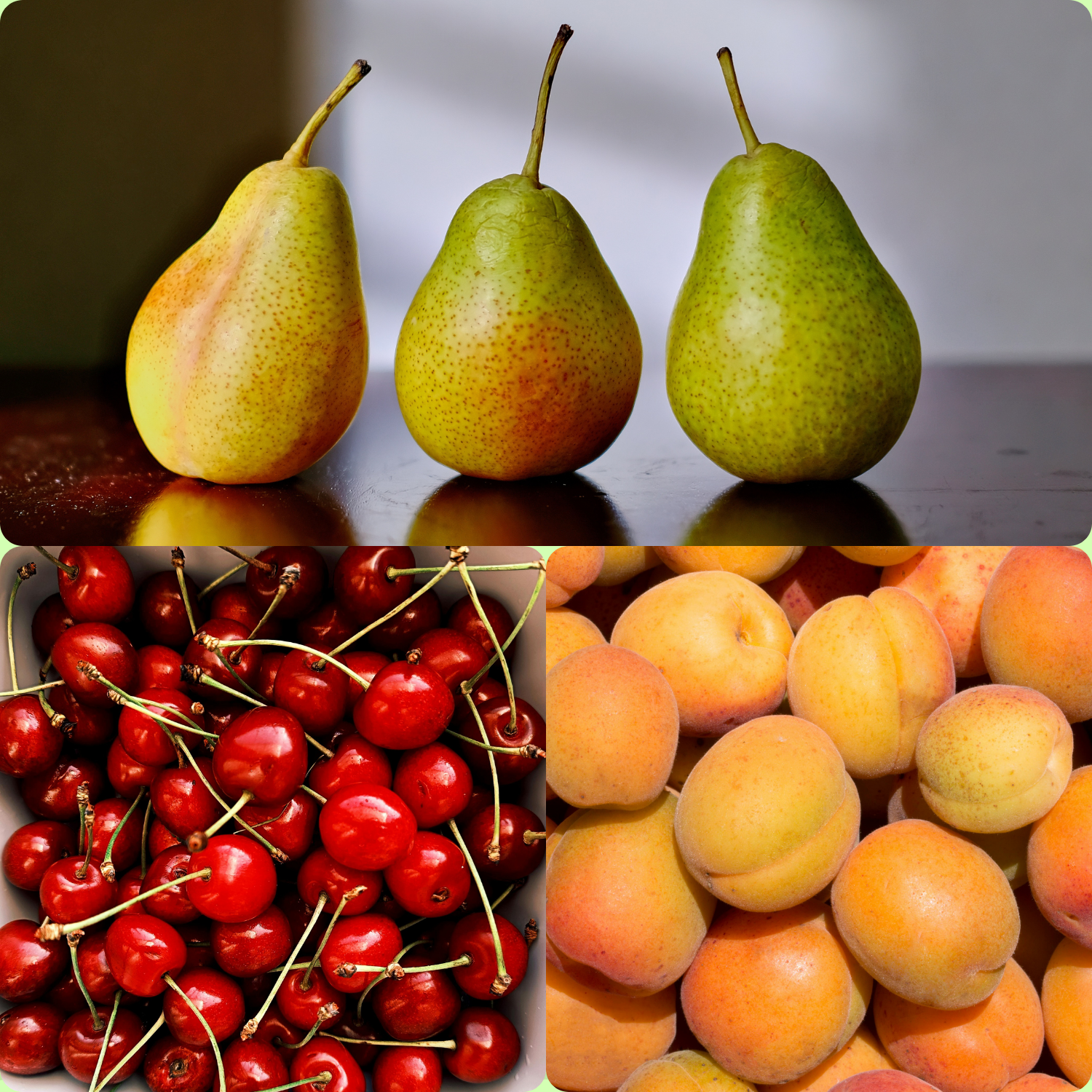 У комплект входять три самоплідні культури: груша 🍐, абрикос 🍑 та черешня 🍒, які добре плодоносять навіть без додаткових запилювачів.