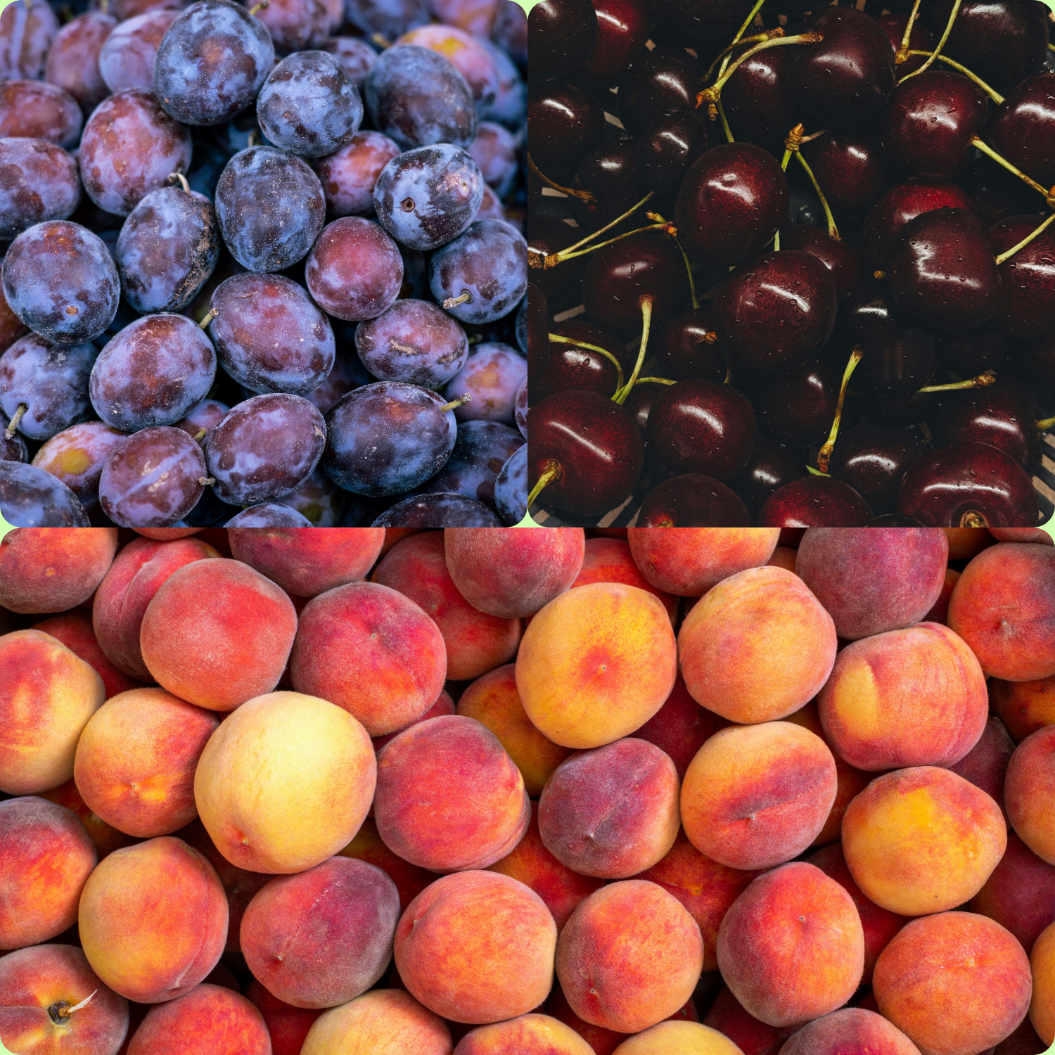 У комплект входять три самоплідні культури: слива 🍑, персик 🍑 та черешня 🍒, які стабільно плодоносять навіть без додаткового запилення.