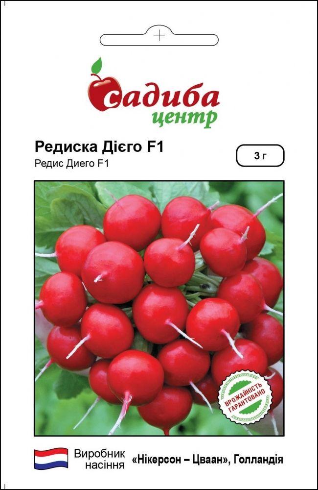Дієго f1 – це ранньостиглий гібрид редиски, з вегетаційним періодом 22 – 24 дні. Високоврожайний гібрид, який вирощують протягом всього сезону, придатний для всіх грунтово-кліматичних умов областей України. Листя темно-зеленого кольору, довжиною до 20 див Плоди червоного кольору, однорідні, щільні, без пустот. М'якоть біла, хрустка. Гібрид спокійно переносить зниження температури, нестача світла, стійкий до несправжньої борошнистої роси.