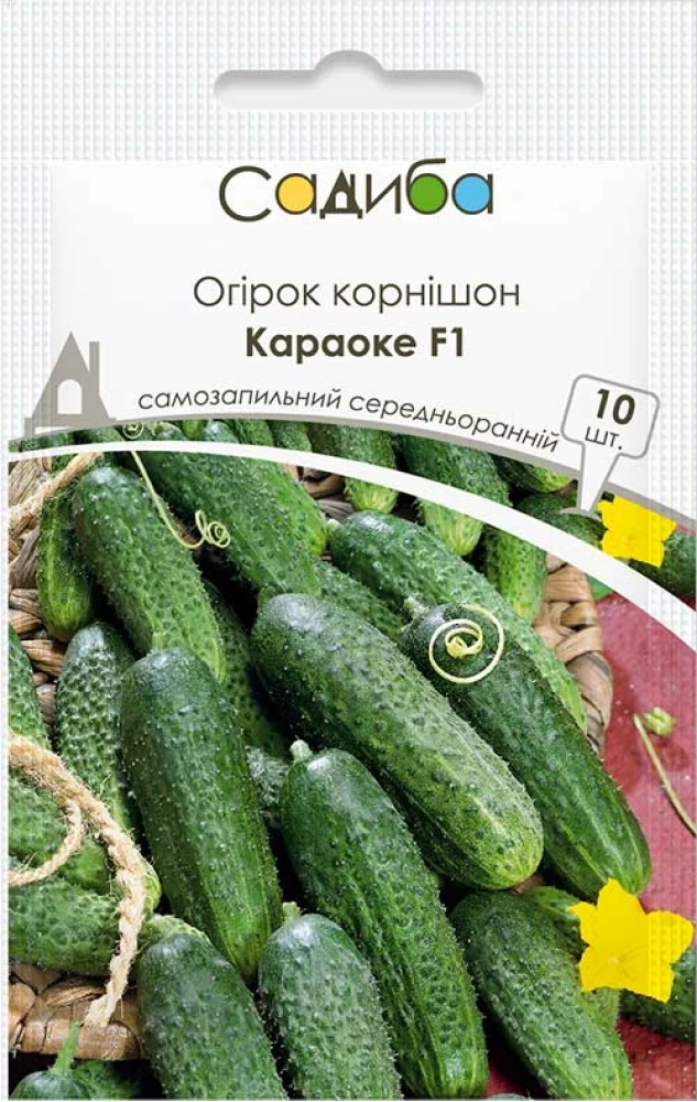 Огірок Караоке F1 – середньоранній (55-60 днів) самозапильний гібрид корнішонного типу зі значним потенціалом врожайності для відкритого ґрунту – добре зарекомендував себе в плівкових теплицях в осінньому обороті. Рослина середньогенеративного типу з хорошим відростанням бічних пагонів.