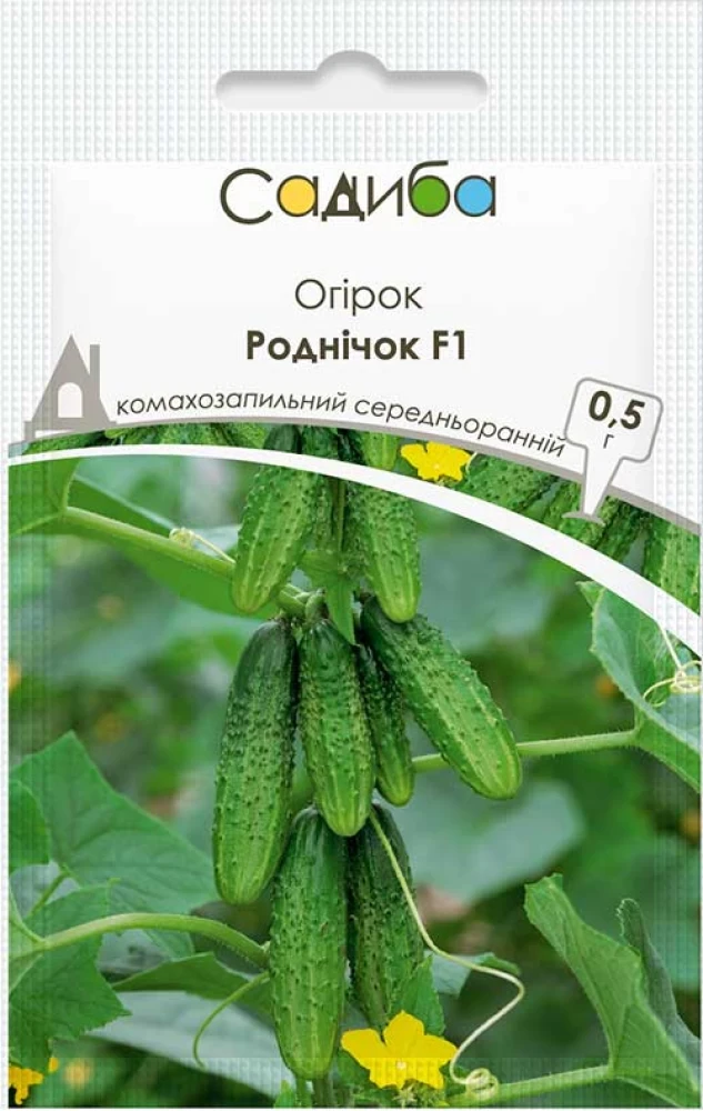 Роднічок F1 – середньостиглий бджолозапильний, високоврожайний гібрид для відкритого грунту і плівкових укриттів. Вегетаційний період від появи сходів до збору врожаю 50-55 днів. Кущ високорослий, довжина батогів до 3 м. Тип цвітіння жіночий. Плоди слабкобугорчасті, зелені зі світлими смугами до середини плода, без гіркоти, рівненькі, з маленькими чорними шипами, м'якоть хрустка. Розмір плодів 9-12см, діаметр – 4-6см. Середня маса 90-110 г. Загальна врожайність за сезон досягає 17-25кг з 1 квадратного метра під плівкою і 5-7кг з 1 квадратного метра для відкритого грунту. Перевагою сорту є стійкість до спеки, ряду хвороб (справжньої і несправжньої борошнистої роси, оливкової плямистості), тривалий період плодоношення, збереження товарних якостей (не жовтіють і не буріють), добре переносить транспортування, прекрасний у засоленні. Огірки можна вирощувати розсадним способом або посівом насіння у відкритий грунт. Насіння на розсаду висівають у квітні, в окремі стаканчики на глибину 1,5-2,0 см, при температурі 25 ° С. Коли з'являться сходи температуру знизьте до 15 ° С. Коли мине загроза повторних заморозків, розсаду висадіть в грунт. Висівати насіння огірків у відкритий грунт можна тільки тоді, коли він прогріється до 14-15 ° С. Посів: друга половина травня – початок червня. Глибина загортання насіння 2-3 см. Схема посадки: 70-90х30 см. Підходить для вирощування в сухих і жарких умовах. Догляд за рослинами полягає в прополці, розпушуванні і підгодівлі.
