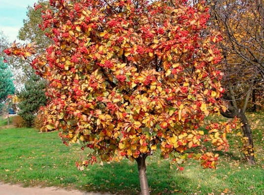 Плоди: Яскраво-червоні дрібні ягоди, зібрані в суцвіття, декоративні, привабливі для птахів, неїстівні для людей, зберігаються на дереві до зими.