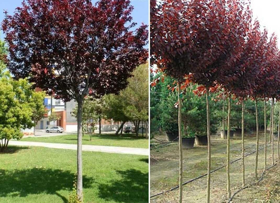 Декоративна, листопадна, червонолисна дерево на штамбі з овальною формою крони темно-пурпурного відтінку, через що здалеку здається майже чорним.