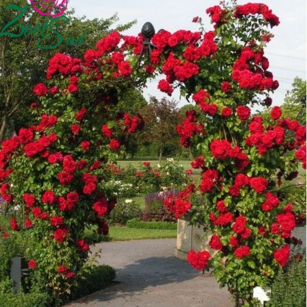 Ефектна плетиста троянда з великими густомахровими квітками насичено-червоного кольору. Довгі пагони добре підходять для озеленення арок, пергол і огорож. Під час цвітіння кущ виглядає дуже декоративно та привертає увагу яскравими великими квітами. Цвіте хвилями протягом усього сезону і стане яскравою окрасою будь-якого саду. 🌹