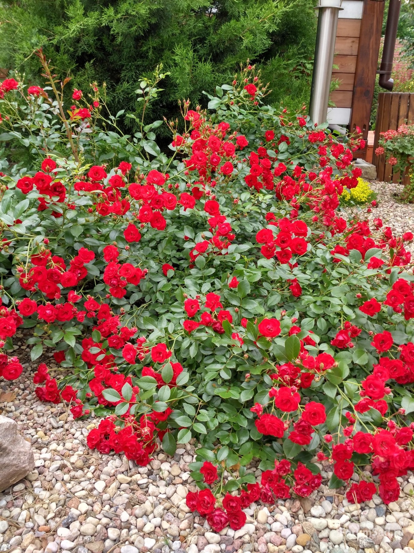Ефектна троянда з яскравими червоними квітками, яка утворює широкий розлогий кущ. Довгі гнучкі пагони під час цвітіння рясно вкриваються великими суцвіттями, створюючи яскравий квітучий килим. Сорт відзначається високою стійкістю до хвороб і морозів, добре переносить різні погодні умови та підходить як для приватних садів, так і для озеленення парків і громадських територій. 🌹