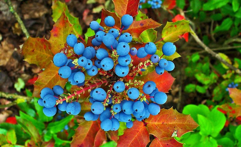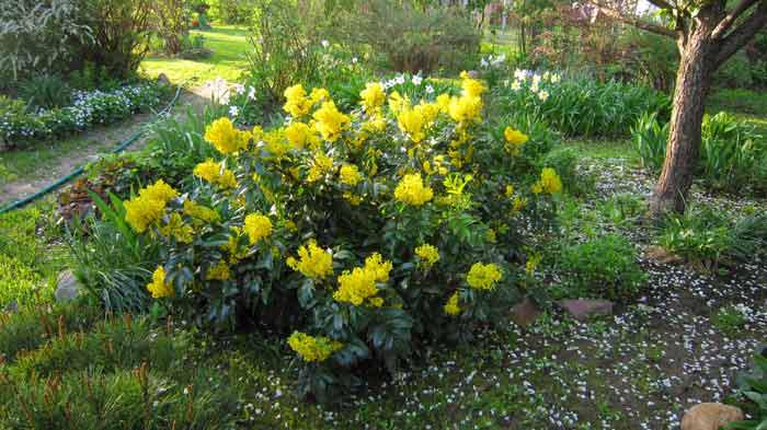 Магонія має блискуче різьблено-зубчасте темно-зелене листя, схоже на листя падуба, тому й отримала таку назву. Неймовірно красива саме навесні, коли вкривається золотистими квітами, зібраними у грона, на фоні рельєфного листя.