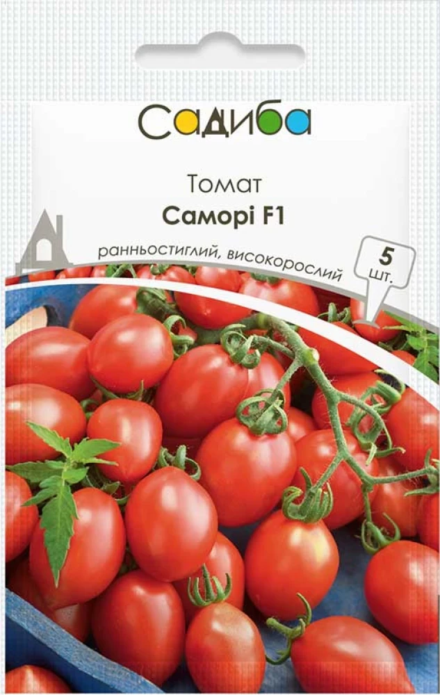 Томат Саморі F1 – ранньостиглий (65-70 днів після висадки розсади) високорослий гібрид типу міді-сливка – високопродуктивний, для вирощування в теплицях навесні з літньою пересадкою. На сильнорослих міцних рослинах формуються плоди вагою 50-55 г, яскраво-червоного кольору, з кисло-солодким смаком, зібрані у привабливі китиці.